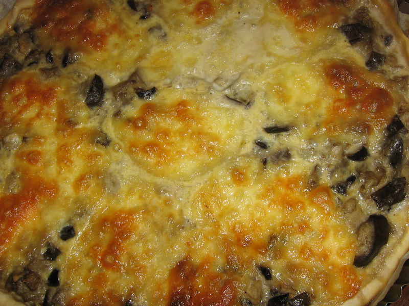 - 1 pâte brisée - 2 aubergines - 3 œufs - 20 cl de crème - 2 boules de mozzarella - sel et poivre- 1 échalote - 1 gousse d'ail.