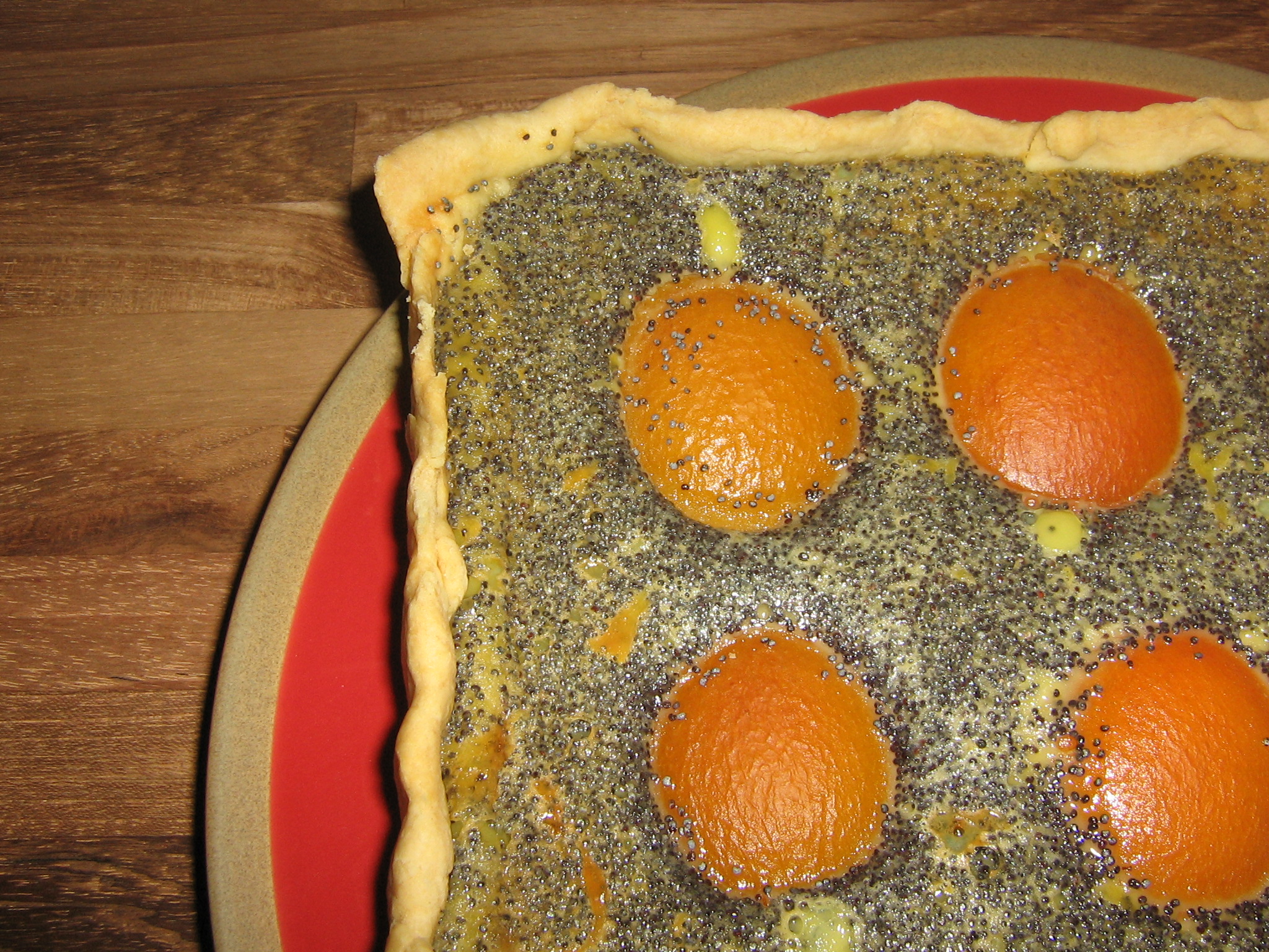 - 6 abricots ( le demi restant pour celle qui prépare la tarte !) - 4 œufs - 20 cl de crème - 100g de sucre - 25 g de pavot.