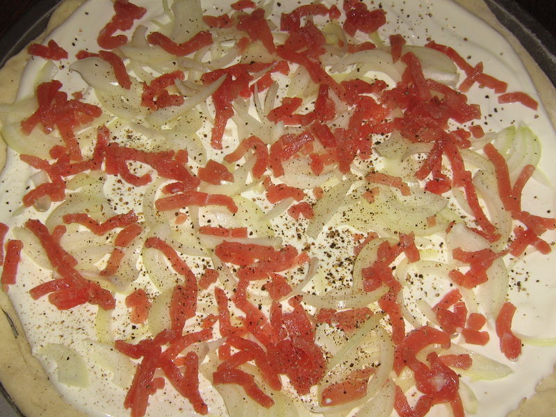 - Ajoutez dessus le mélange fromage blanc crème, l'oignon et les lardons.