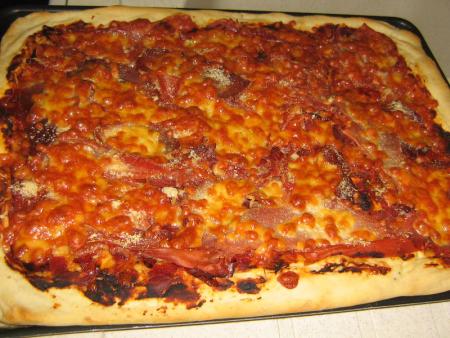 Etalez la pâte à pizza dans un moule. Tartinez d'une petite boite de concentré de tomate. Emiettez dessus coppa et jambon cru.